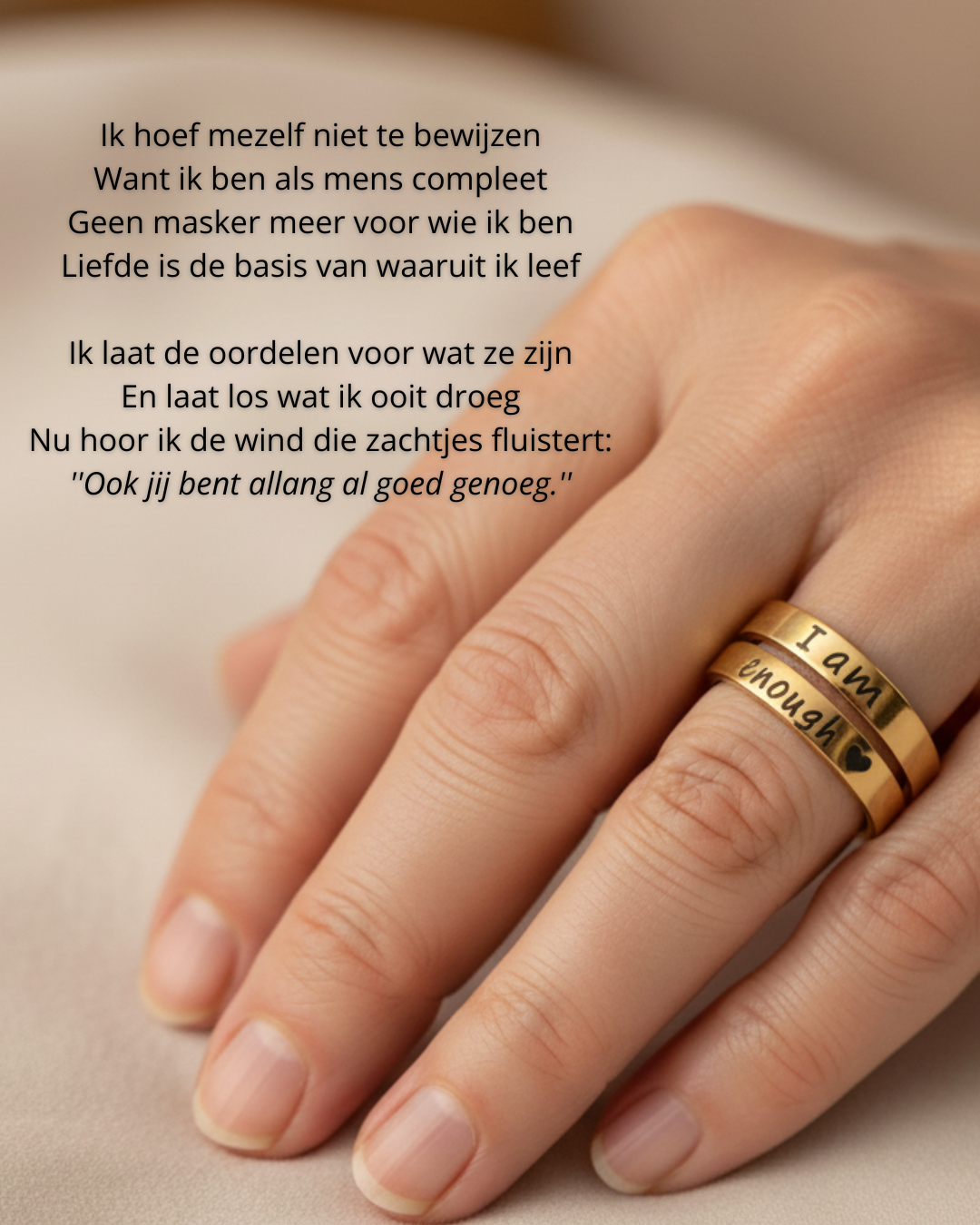 De woorden I am enough raken iets dieps. Ze openen de deur naar zelfliefde – niet als zweverig begrip, maar als een innerlijke erkenning die we vaak nooit bewust hebben gekregen. Het dragen van deze ring maakt dat je, soms onbewust, terugkeert naar jezelf. Naar rust. Naar zachtheid. Naar waardigheid.