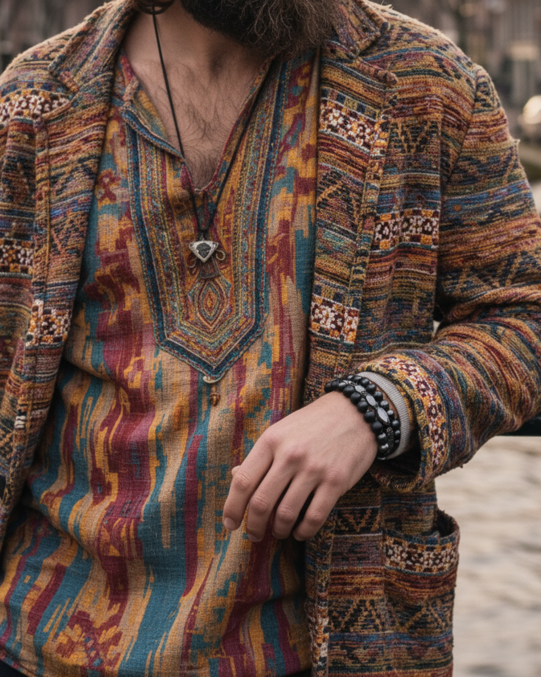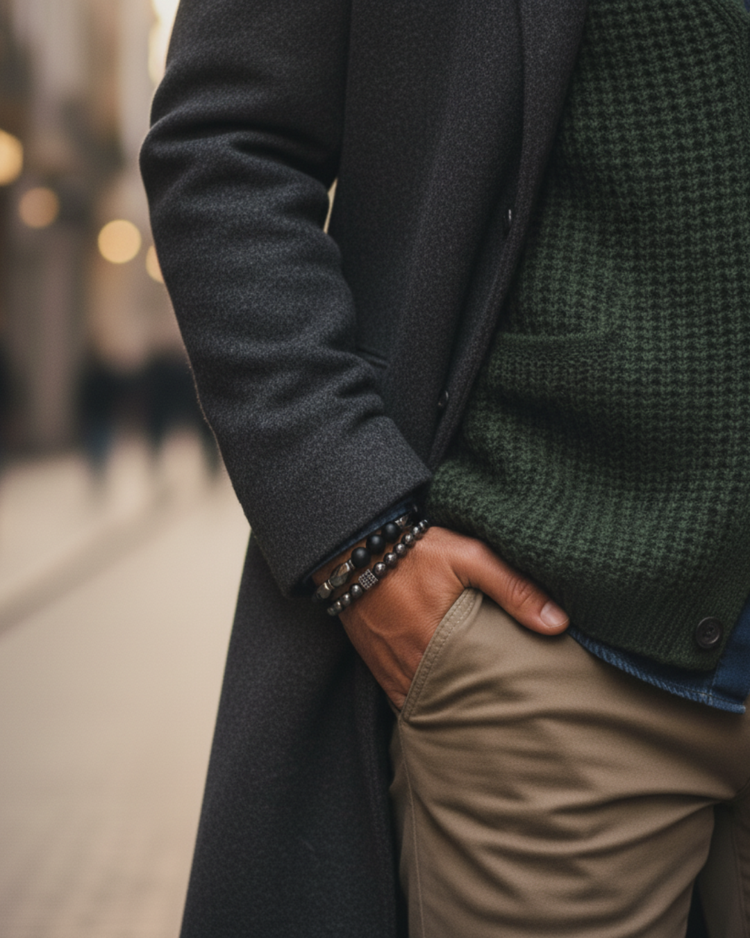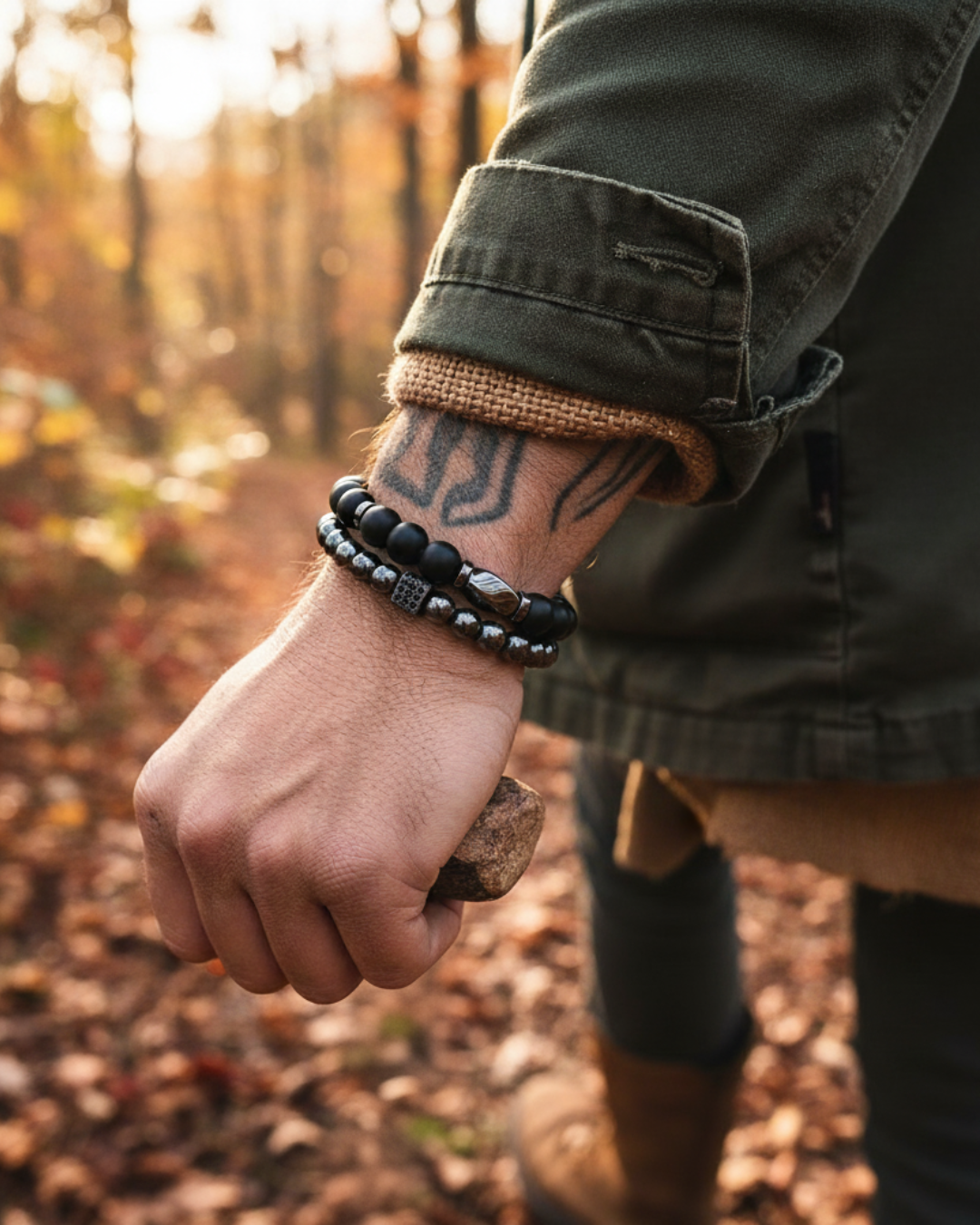 De Omni Custos combineert glanzende hematiet met matzwart onyx – twee stenen die traditioneel staan voor aarding, bescherming en innerlijke helderheid. Gladde ronde stenen, prettig om te dragen, op een elastisch koord.