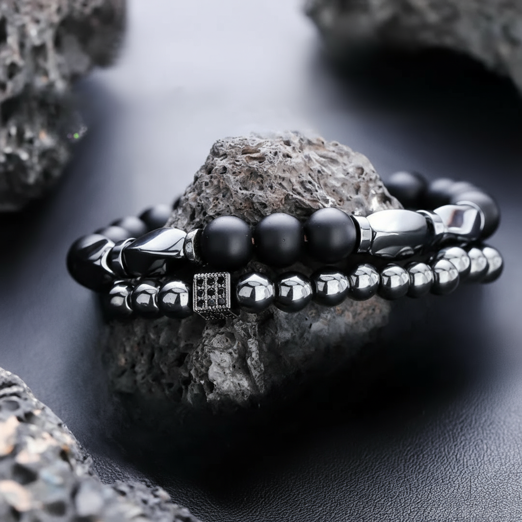Stenen: hematiet (gunmetal-glanzend), zwarte onyx/agaat (matt)